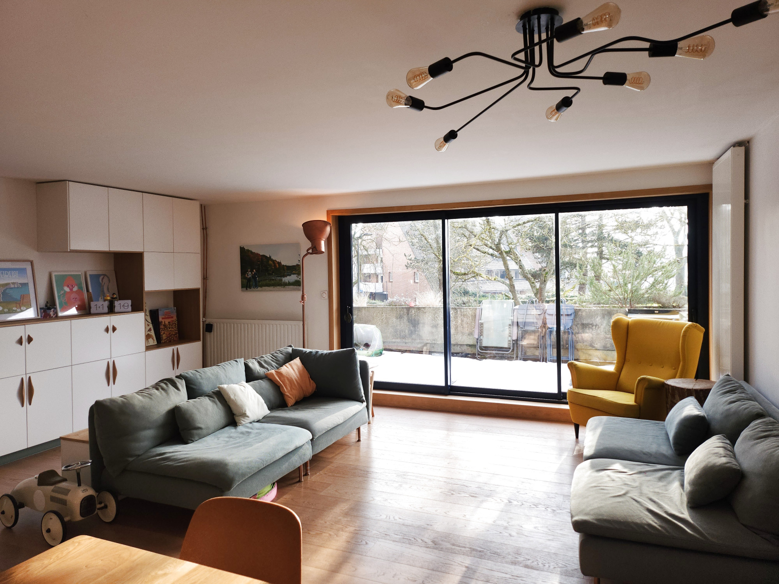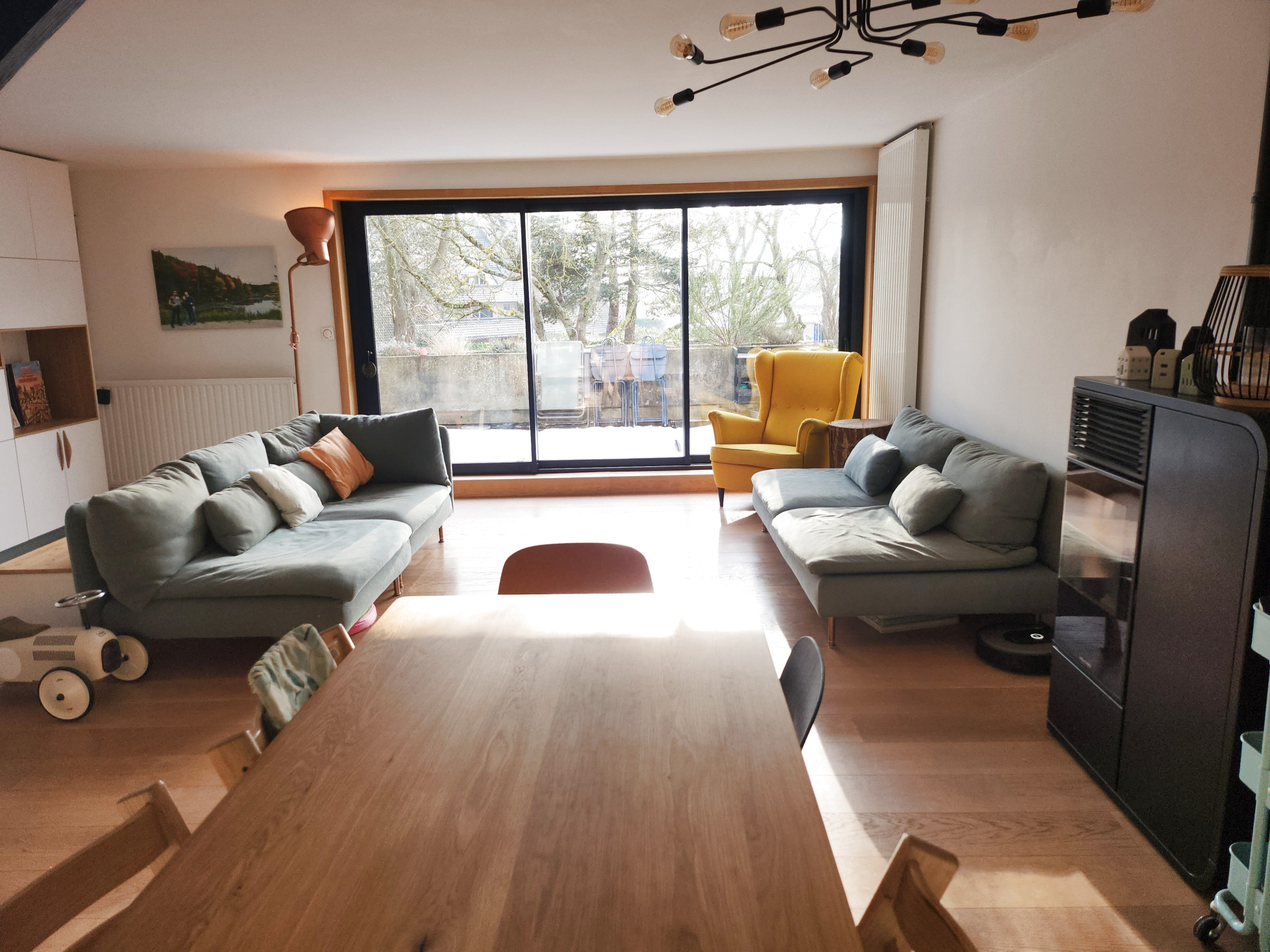 ce bien offre une grande pièce de vie parquetée, cuisine équipée ouverte le tout donnant accès à la terrasse par de larges baies vitrées.
